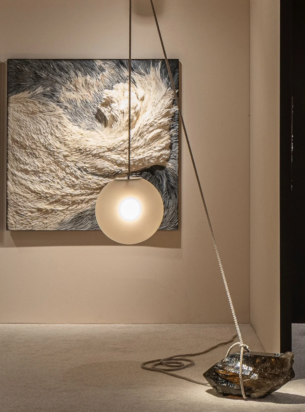 A boulder holds a sandblasted glass sphere balanced by a minimalistic custom-made pulley.